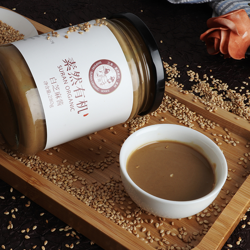 芝麻酱也叫麻酱、麻汁,是芝麻炒熟后经天然青石石磨研磨而制成的酱,风味独特,用处广泛。